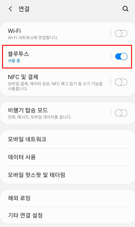 2. 연결 - 블루투스 ( 사용 중으로 해야함 )