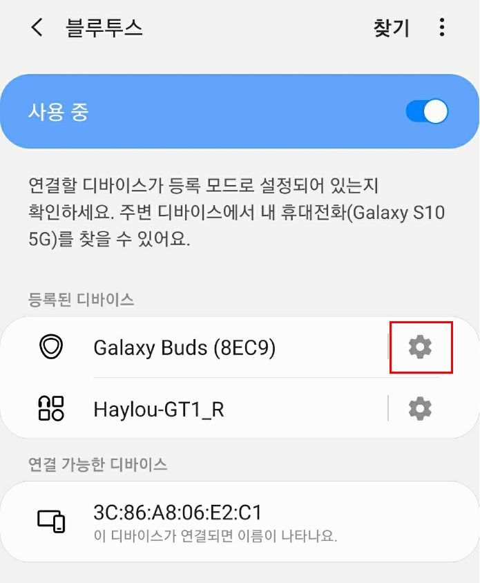 3. 등록이 되어있지만 연결은 되지 않는 Galaxy Buds (8EC9) 이 보임 -> 설정 창 눌러서 들어감
