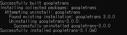 그럼 다음과 같이 기존에 설치되어있던 googletrans가 uninstall 되고 방금 설치한 것이 설치 완료됩니다.